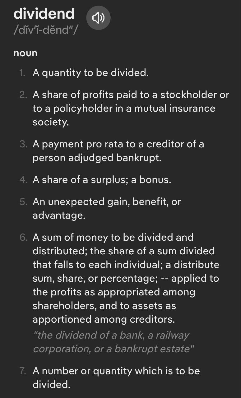 Administrators Pompeii Posted November 21 Author Administrators Posted November 21 PAY ATTENTION!!!! For those that missed it the 1st time... What is the definition of "DIVIDEND"?