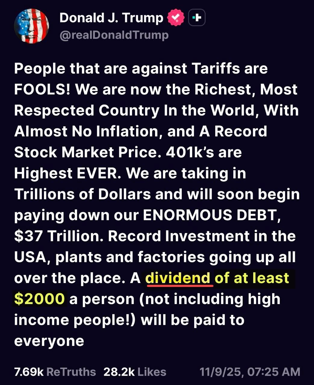 Administrators Pompeii Posted November 9 Administrators Posted November 9 A dividend of at least $2000 a person (not high income) will be paid to EVERYONE!! YES, EVEN TO THE TRUMP HATERS!! Pappy 1