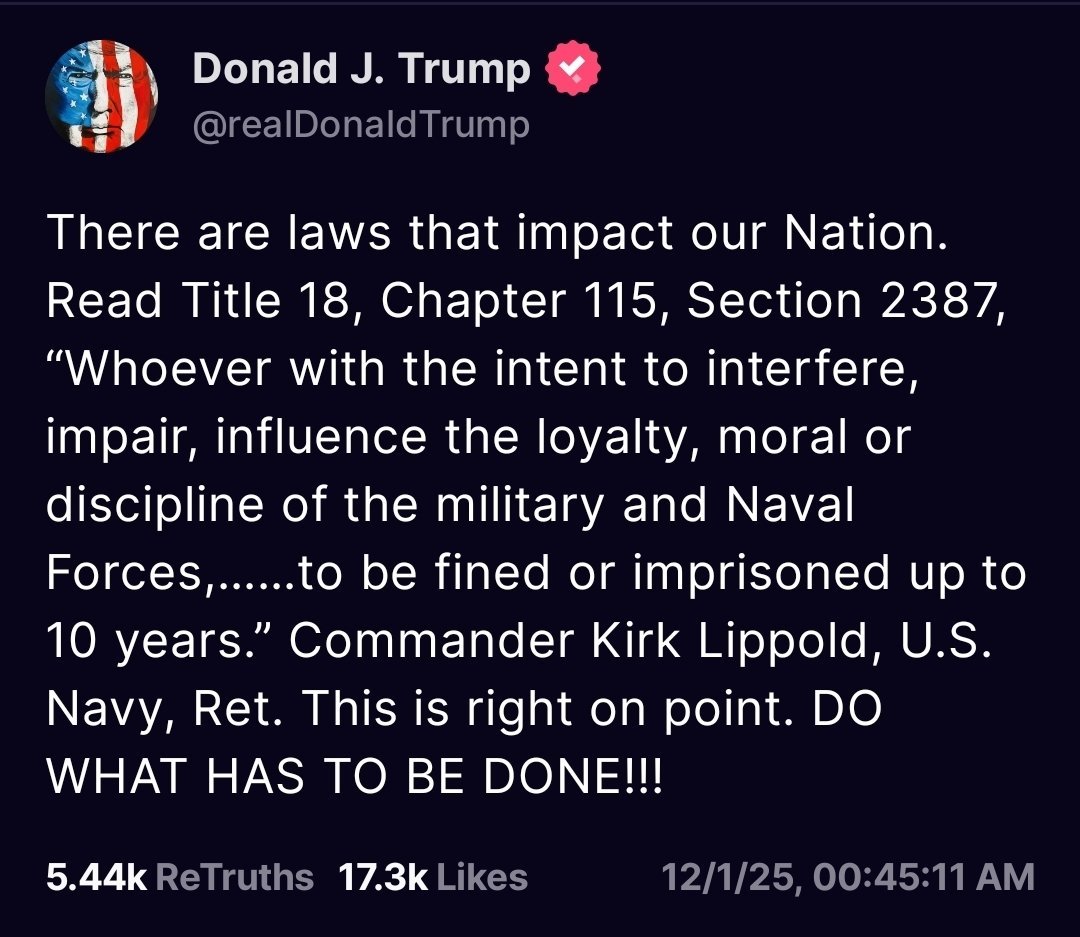 Administrators Pompeii Posted November 22 Author Administrators Posted November 22 SEDITIOUS.President Trump has never issued a single illegal order.The Democrats know exactly what they’re doing – and they’re doing it anyway. pic.twitter.com/LSvZaa4v4r— The White House (@WhiteHouse) November 21, 2025