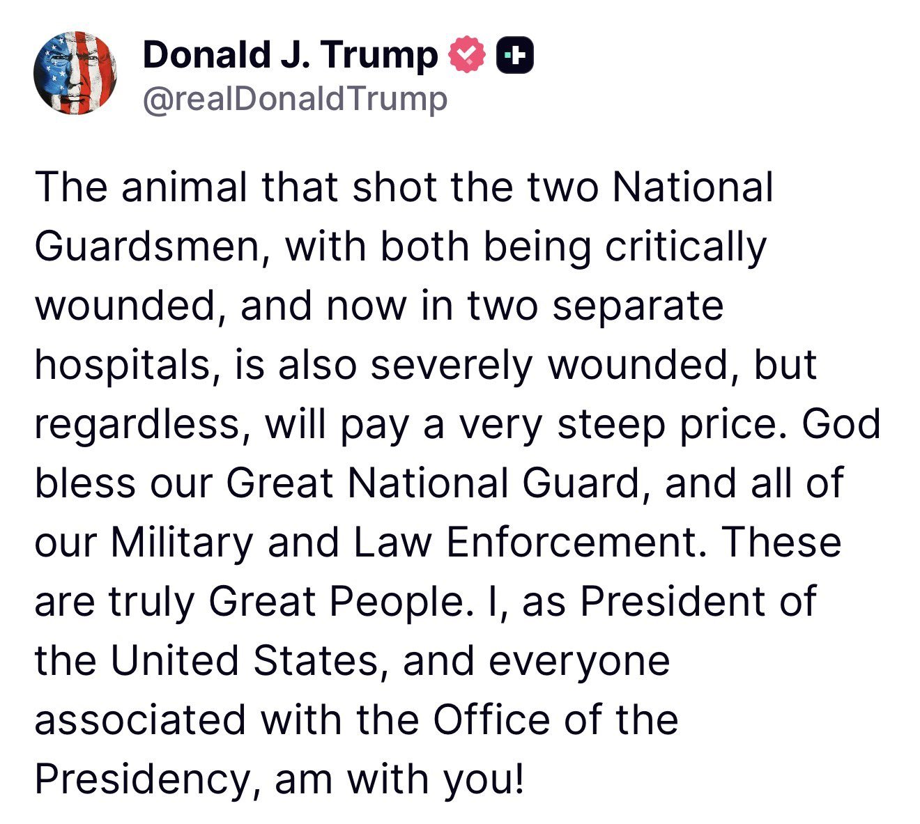 Administrators Pompeii Posted November 27 Author Administrators Posted November 27 .@SecWar: "President Trump has asked me, and I will ask @SecArmy to the National Guard, to add 500 additional troops, National Guardsman, to Washington, D.C... If criminals want to conduct things like this — violence against America's best — we will NEVER back down." pic.twitter.com/xn7hqNvCsG— Rapid Response 47 (@RapidResponse47) November 26, 2025