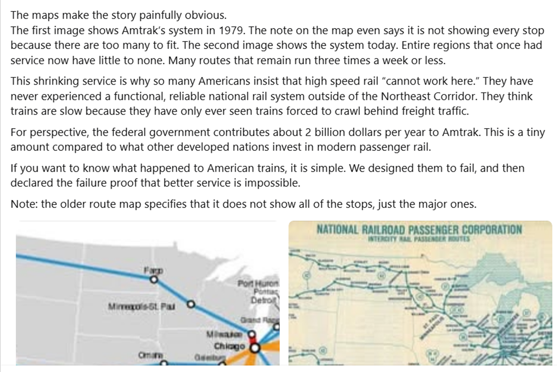 Petee Posted December 1 Posted December 1 Star Corps Industries is at Amtrak Empire Builder. November 28 at 11:00 AM ·Portland, OR · Why does Amtrak Suck So Bad? Sixty years ago, President Nixon signed the Rail Passenger Service Act of 1970, creating the National Railroad Passenger Corporation. We know it today as Amtrak. For decades before that law, private railroads were required to run passenger trains even as they were being crushed by automobiles, airlines, and the new Interstate Highway System. The railroads themselves had also stopped investing in passenger service. The passenger cars were cramped, uncomfortable and over priced - a punishment almost, for being forced to carry passengers. Freight made money. People did not. Amtrak took that burden off their books. The new corporation was expected to run the nation’s passenger system using the freight rail network that already existed. Here is where the first problem began. Amtrak owned almost no track. It had to lease nearly everything from private freight companies. By law, passenger trains have priority. In reality, freight companies have ignored that rule for half a century. A passenger service cannot stay solvent when it cannot stay on time. When a freight company intentionally runs trains longer than the sidings they are supposed to pull into, that is not an accident. That is obstruction. Amtrak, as a federally owned for-profit corporation, has no legal authority to sue the freight companies that cause these delays. Only the Department of Justice can do that. In fifty years, it has never done so. Almost every administration has treated Amtrak funding as a waste to be cut. Even President Carter, a leader I respect, attempted to eliminate nearly half of Amtrak’s long-distance routes. Sixteen percent of them were cut in the end.