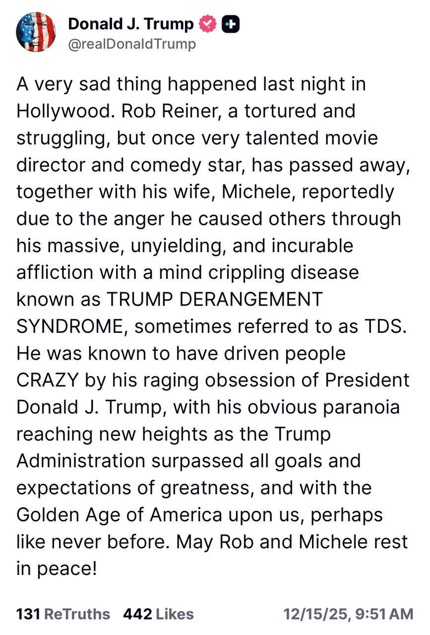 Administrators Pompeii Posted December 15, 2025 Author Administrators Posted December 15, 2025 President Trump’s response was nice knowing who Rob Reiner was. It’s also not about politics or parties. IT IS ABOUT EVIL. THESE PEOPLE ARE SICK. President Trump’s response was nice knowing who Rob Reiner was. It’s also not about politics or parties. IT IS ABOUT EVIL. THESE PEOPLE ARE SICK. 🤮 pic.twitter.com/3nWcDhw0AF— 🇺🇸🍩 JULIE DONUTS 🇺🇸🍩 (@Juliesnark1731) December 15, 2025